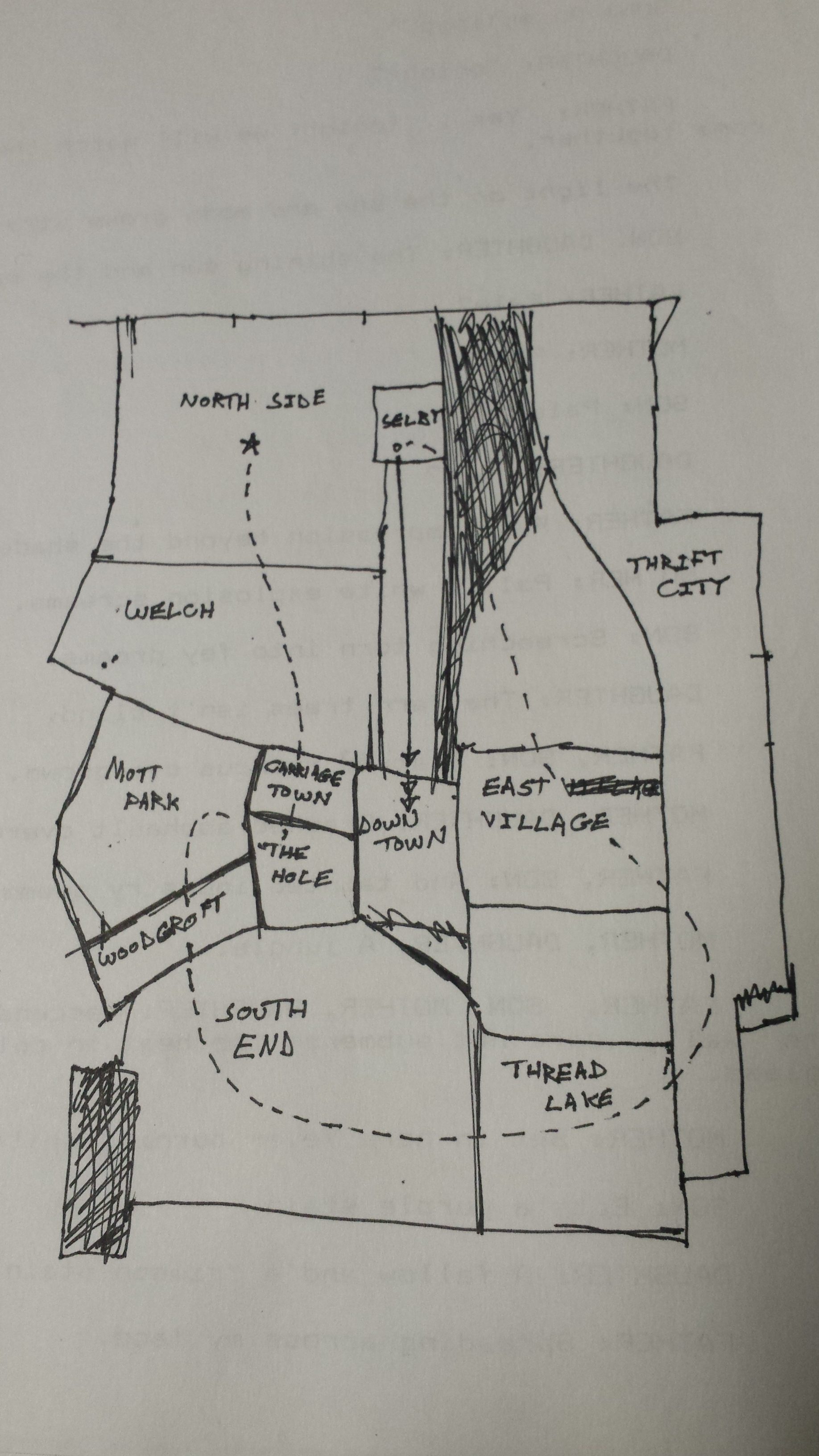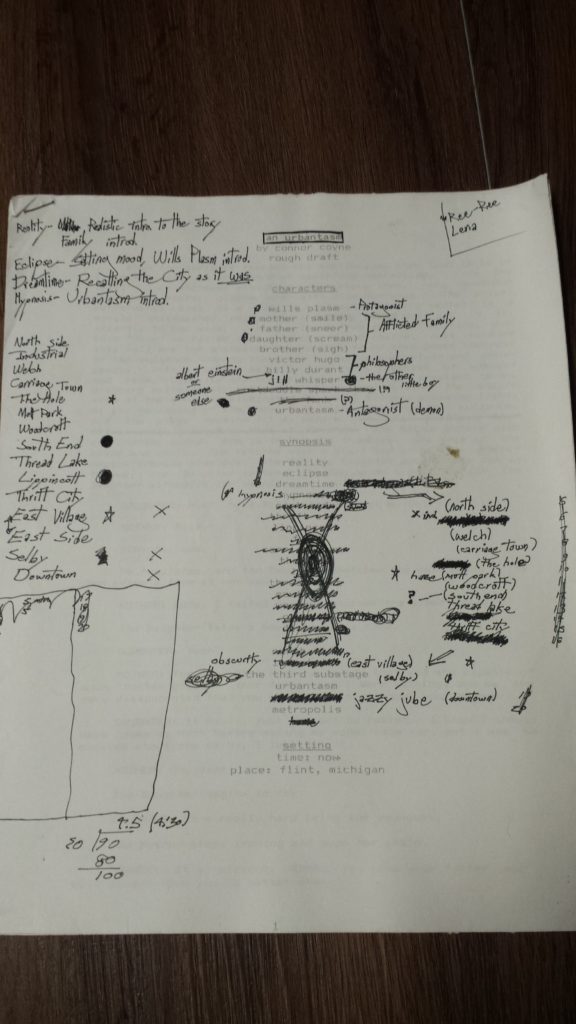 This particular script was sort of a liminal thing where I knew I wanted a romantic(ist) autopsy of Flint’s soul, but I was envisioning it more as an hourlong piece of histrionic theater with symbol-characters as opposed to the modern day Les Misérables which was the first coherent model for the story. But there are traces: Victor Hugo does make an appearance as a “philosopher” along with Billy Durant (?) and “Albert Einstein or Someone Else.” The story features a long walk through the city at night which (tiny spoiler) is still present in 2017 version. And the chief symbol-character, Wills Plasm, would quickly evolve into John Bridge who you’ll meet on page 1 next year.  As for the title An Urbantasm, my brother was reading Phantasmagoria by Lewis Carroll that year and I thought “portmanteau is awesome!”