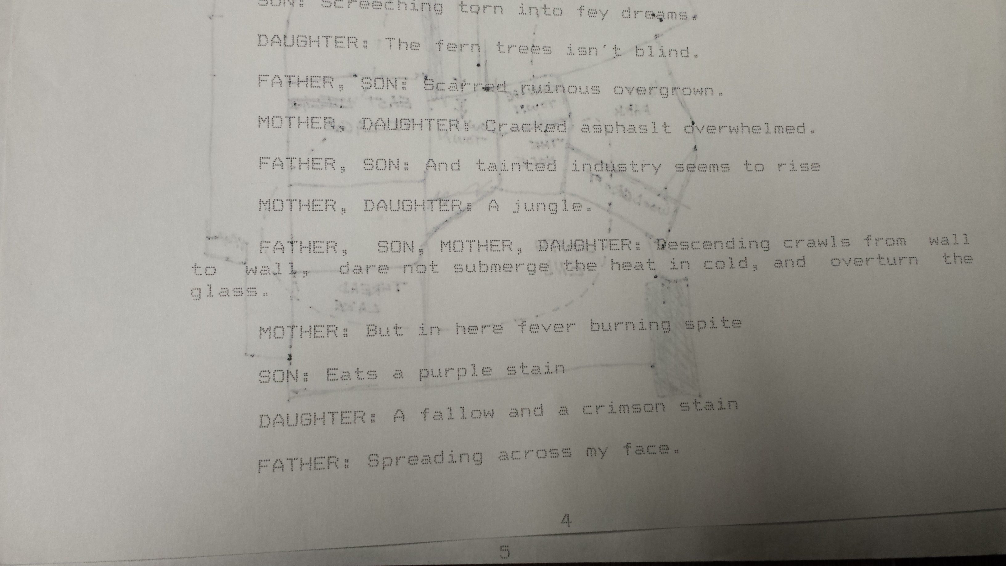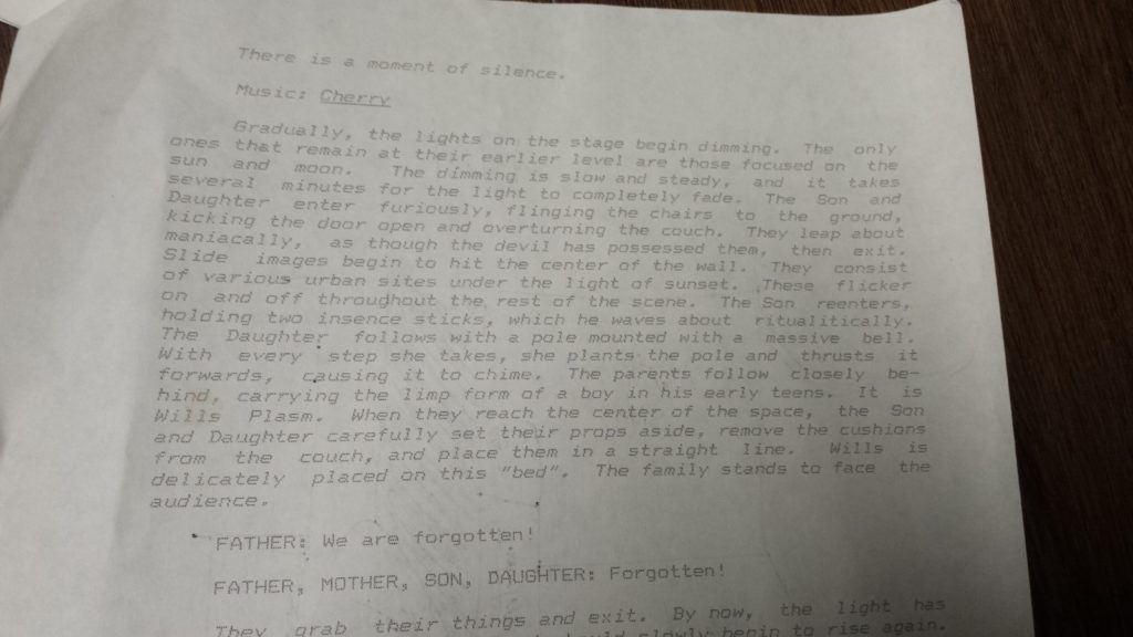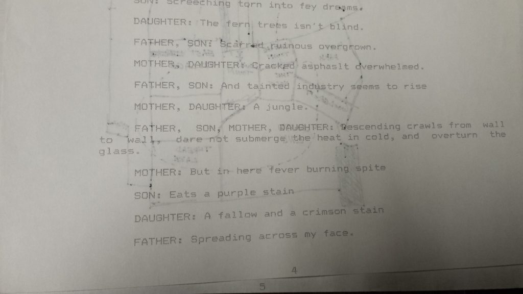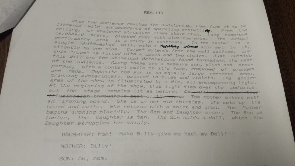 Yeah, this here is all rather raw, and I’m slightly embarrassed sharing it today, in its “subtle as a falling anvil” approach. Then again, seventeen-year old me could write some pretty good stage directions. It’s all good for a poignant, nostalgic smile today.
